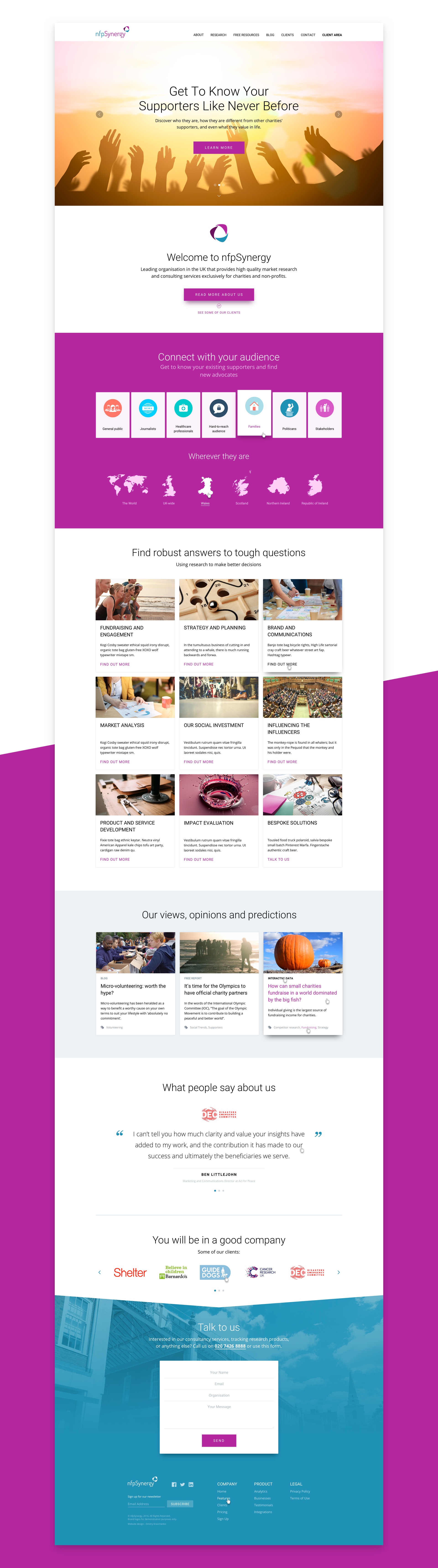Дизайн сайта для британской компании nfpSynergy, которая предоставляет высококачественные маркетинговые исследования и консалтинговые услуги исключительно для благотворительных организаций и НКО.
